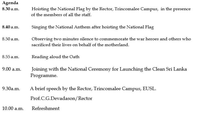 The Trincomalee Campus, Eastern University Sri Lanka had taken initiatives to compile with the contents of this Circular. Accordingly the following activities had been included in the agenda and all of the activities completed successfully. The Agenda of this programme is appended below and the photographs corresponding each activities are annexed as an evidences.