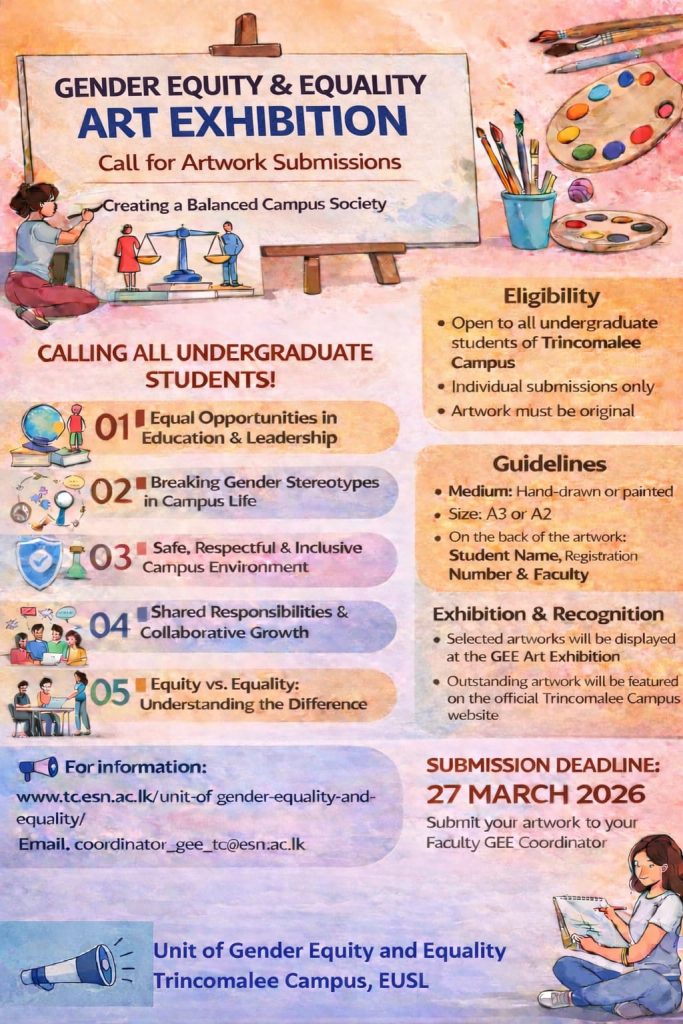 The Unit of Gender Equity and Equality, Trincomalee Campus, Eastern University, Sri Lanka, warmly invites undergraduate students from all faculties to participate in a campus-wide art exhibition focused on Gender Awareness and Equality.