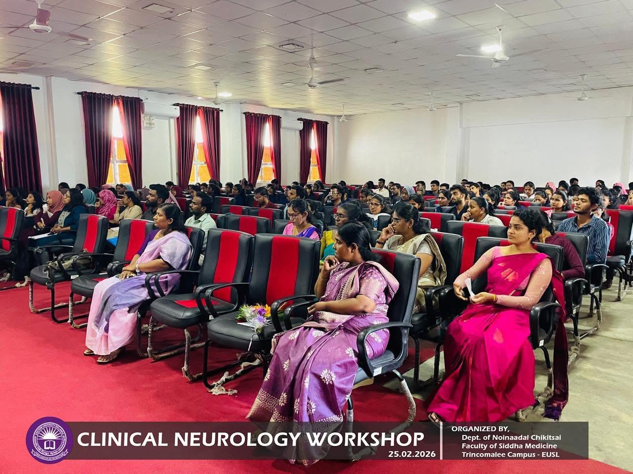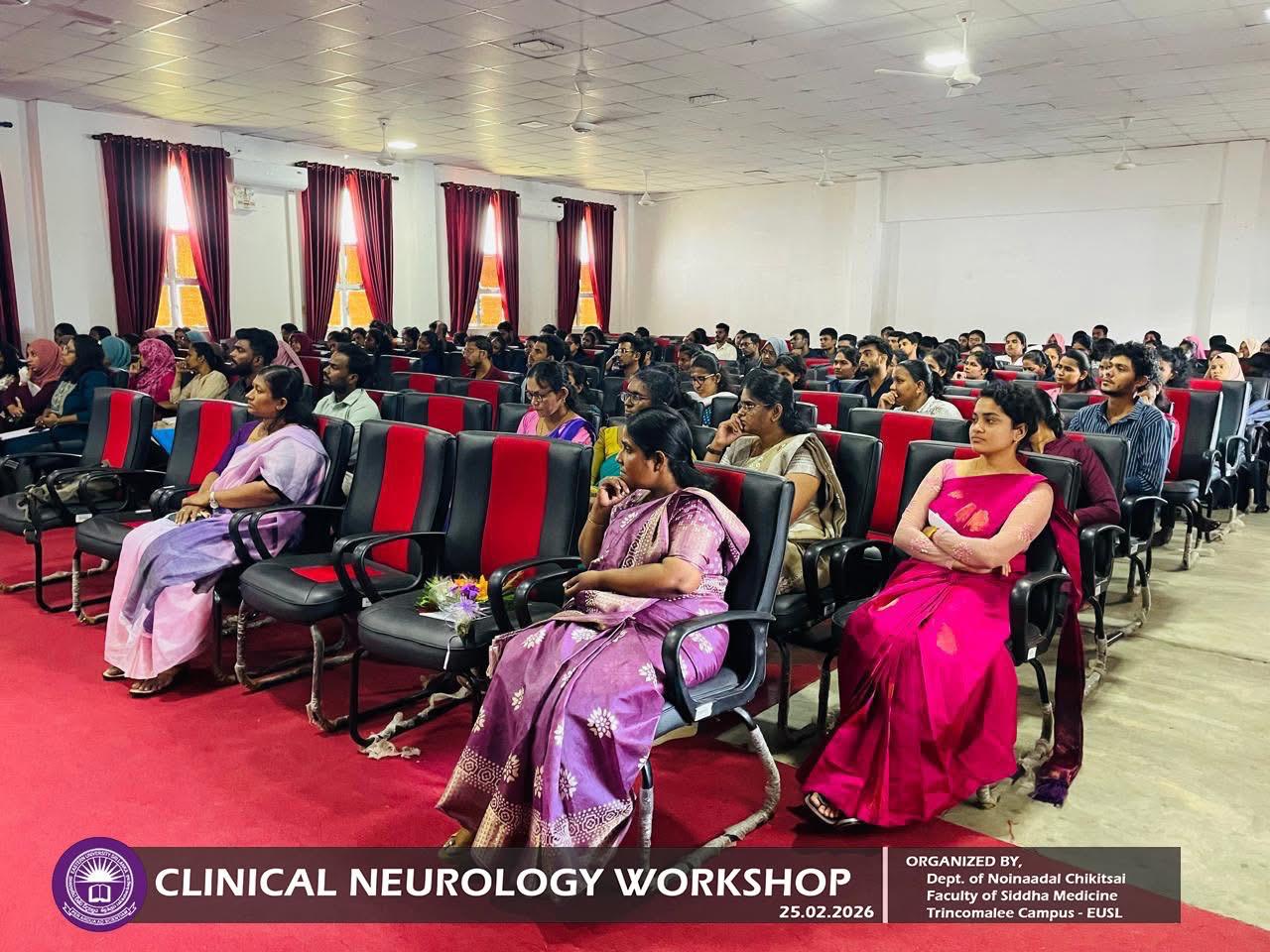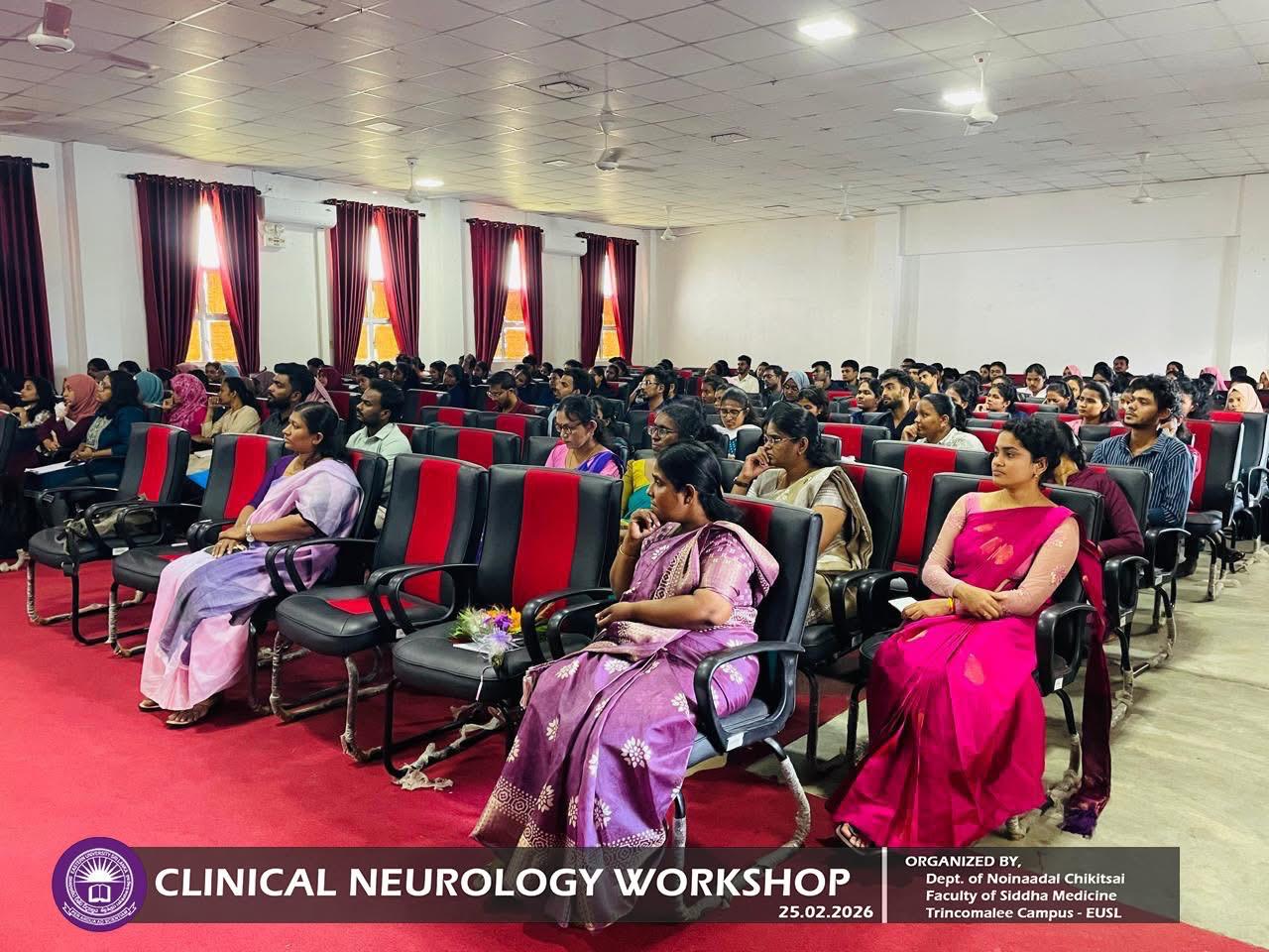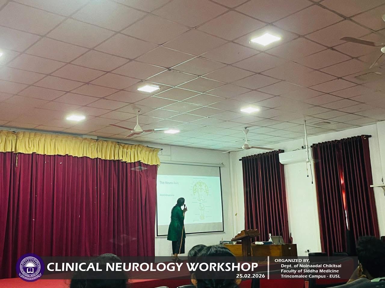 Department of Noinaadal Chikitsai, Faculty of Siddha Medicine, Eastern University, Sri Lanka, successfully conducted the workshop titled “Fundamentals of Clinical Neurology: A Diagnostic Approach” on 25th February 2026, from 10.00 a.m. to 12.00 noon at the Mini Auditorium, Information Technology Centre, Trincomalee Campus.