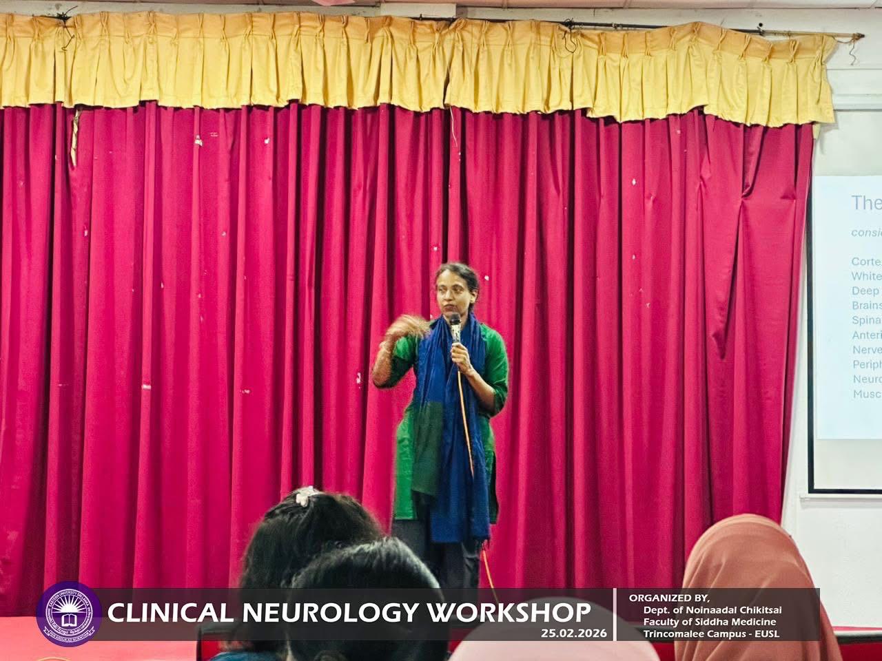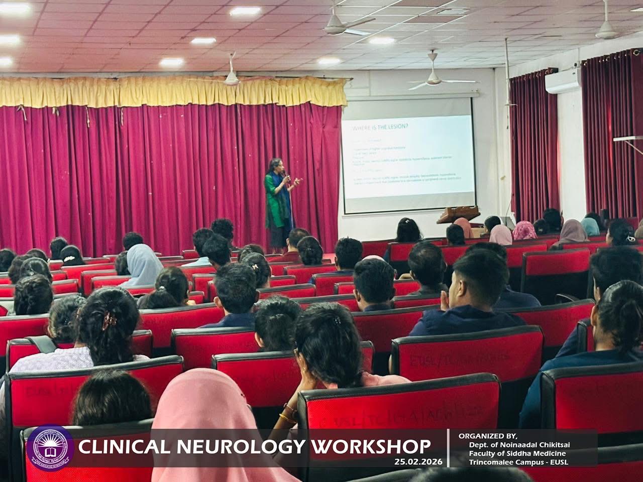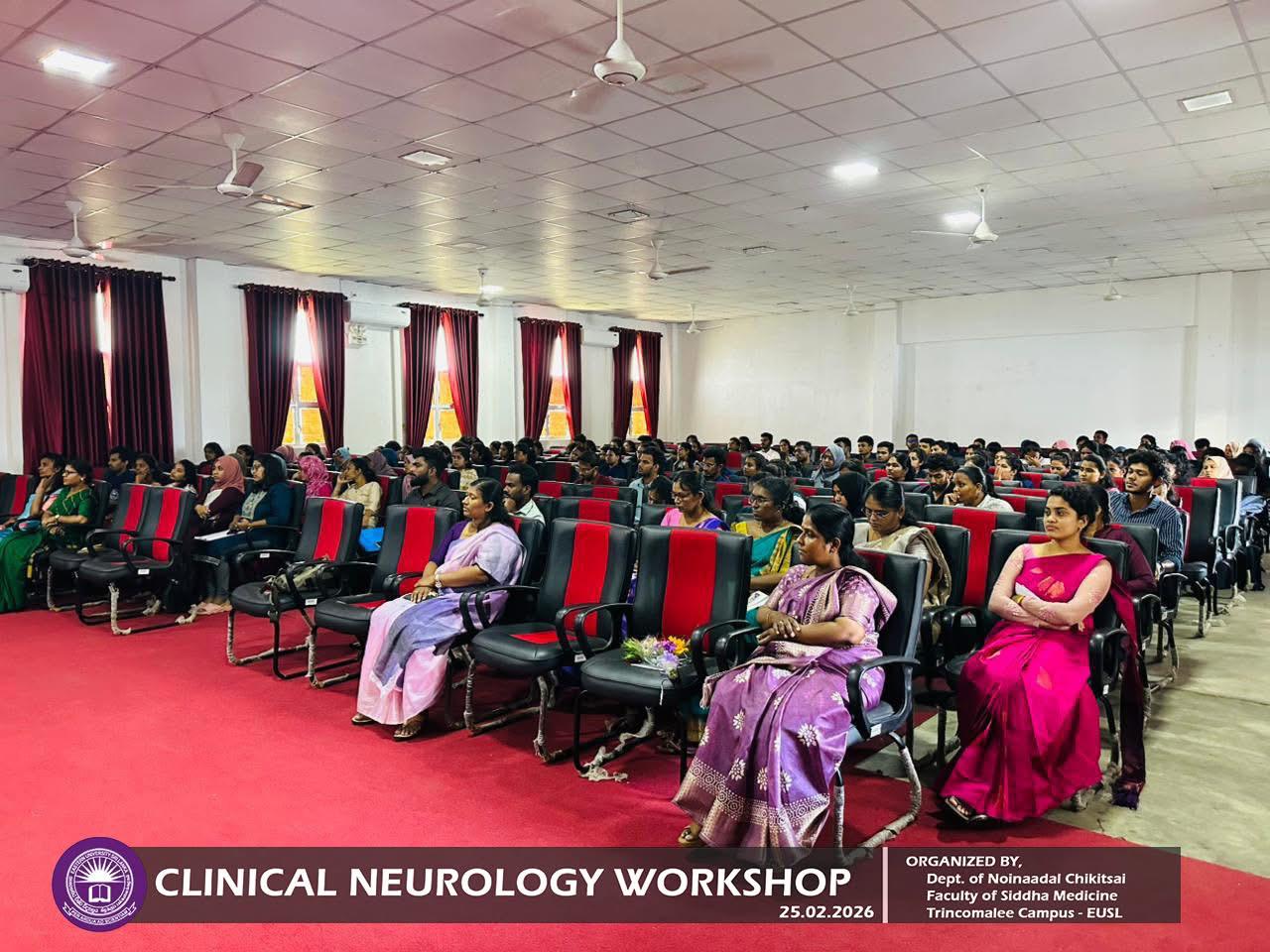 Department of Noinaadal Chikitsai, Faculty of Siddha Medicine, Eastern University, Sri Lanka, successfully conducted the workshop titled “Fundamentals of Clinical Neurology: A Diagnostic Approach” on 25th February 2026, from 10.00 a.m. to 12.00 noon at the Mini Auditorium, Information Technology Centre, Trincomalee Campus.