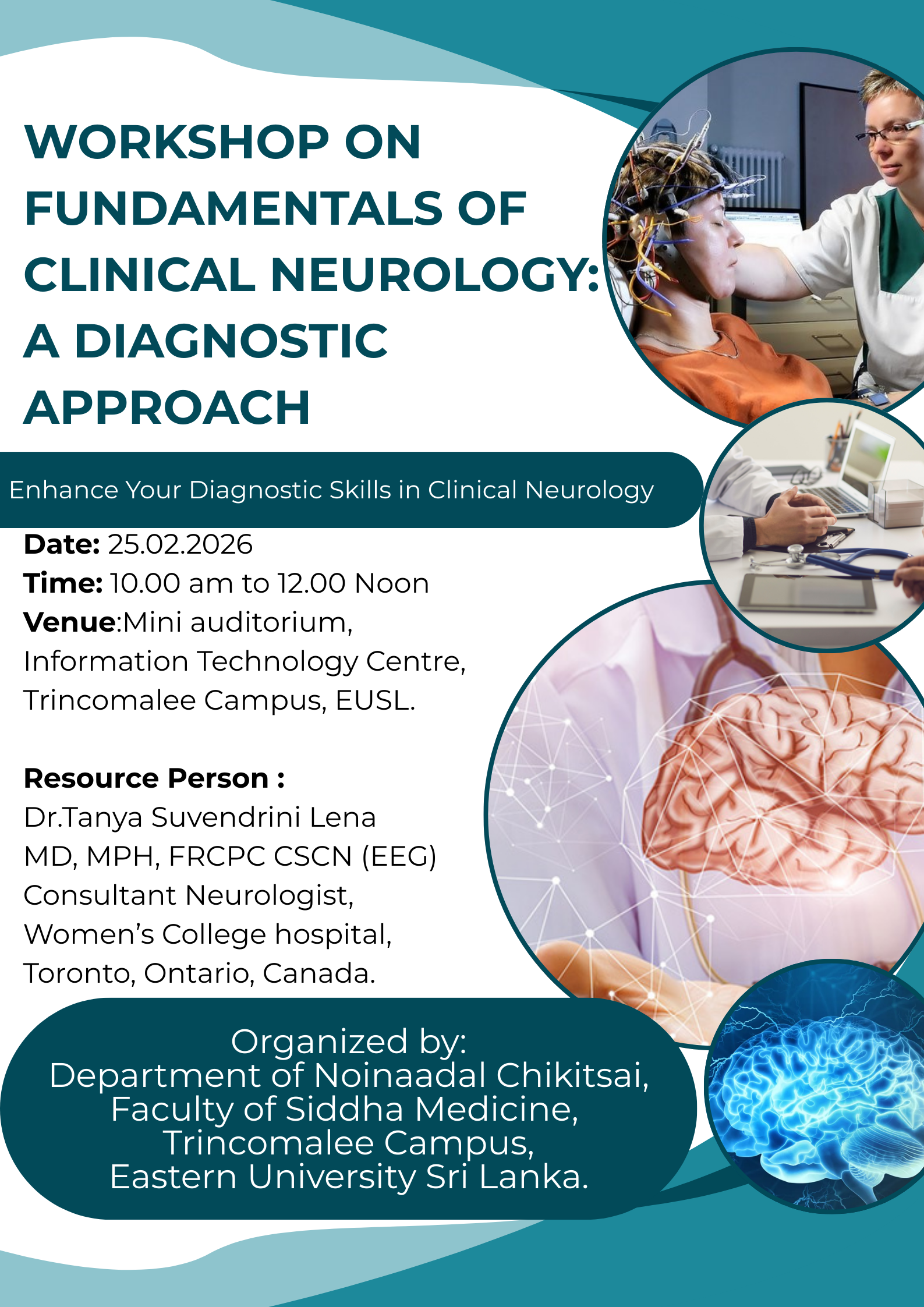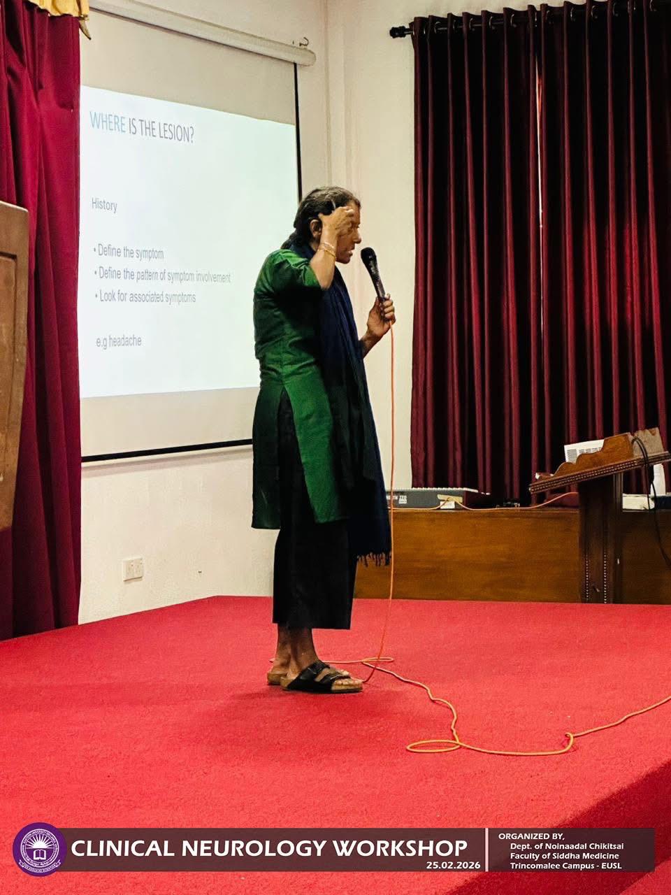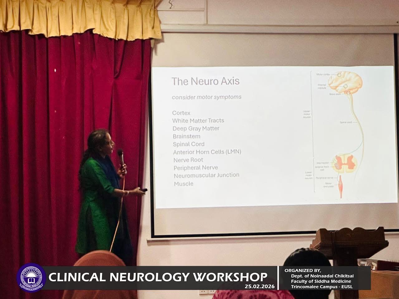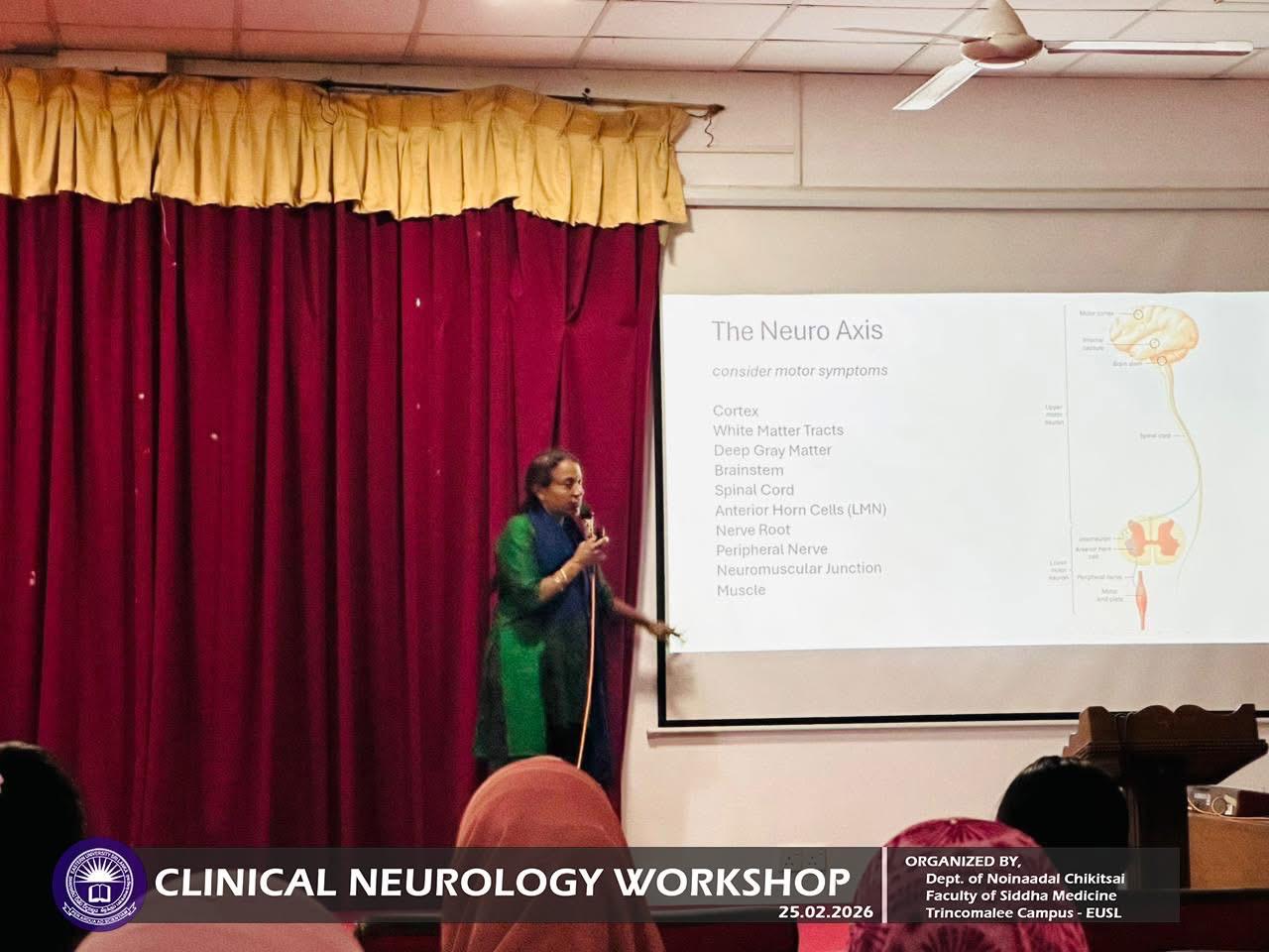 Department of Noinaadal Chikitsai, Faculty of Siddha Medicine, Eastern University, Sri Lanka, successfully conducted the workshop titled “Fundamentals of Clinical Neurology: A Diagnostic Approach” on 25th February 2026, from 10.00 a.m. to 12.00 noon at the Mini Auditorium, Information Technology Centre, Trincomalee Campus.